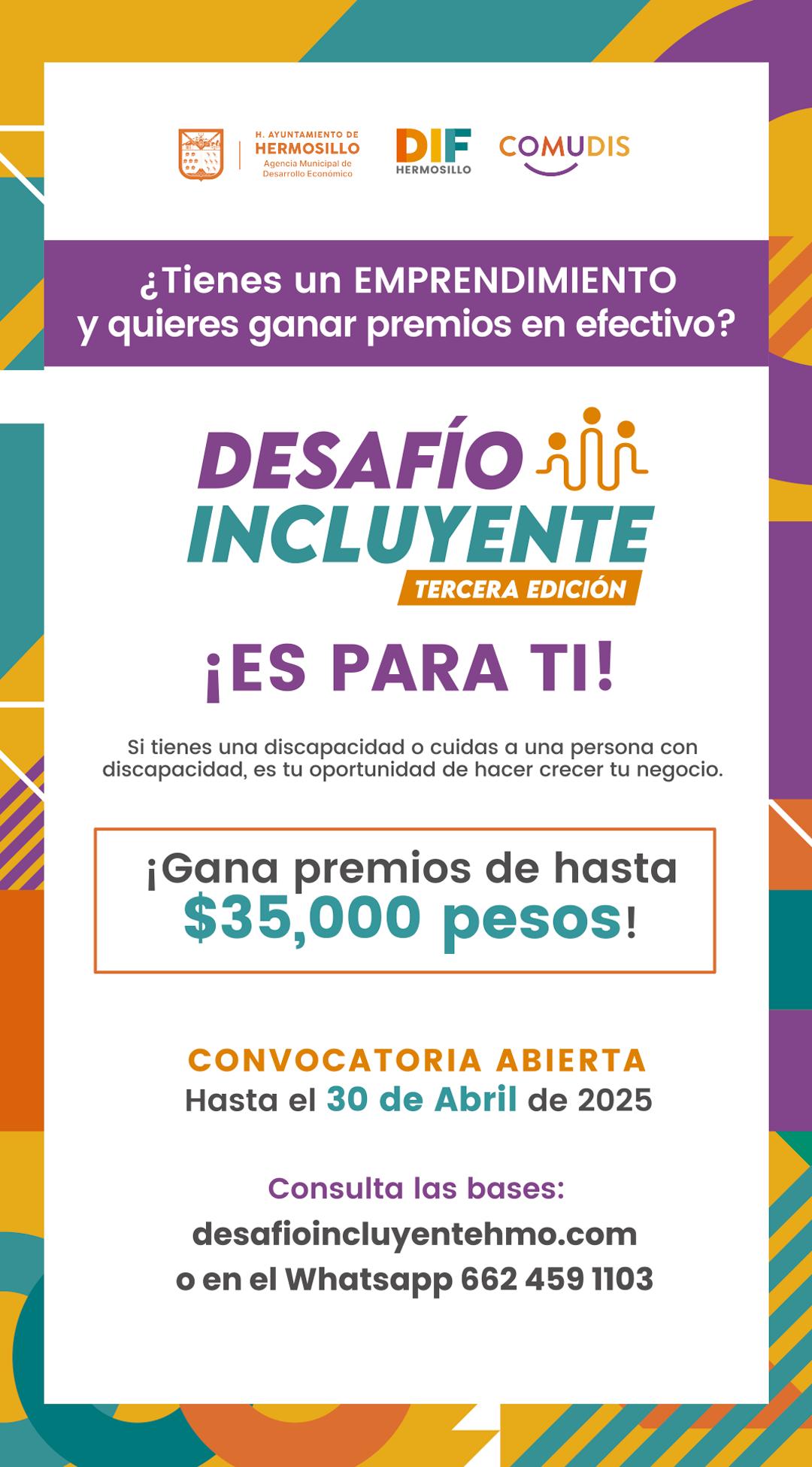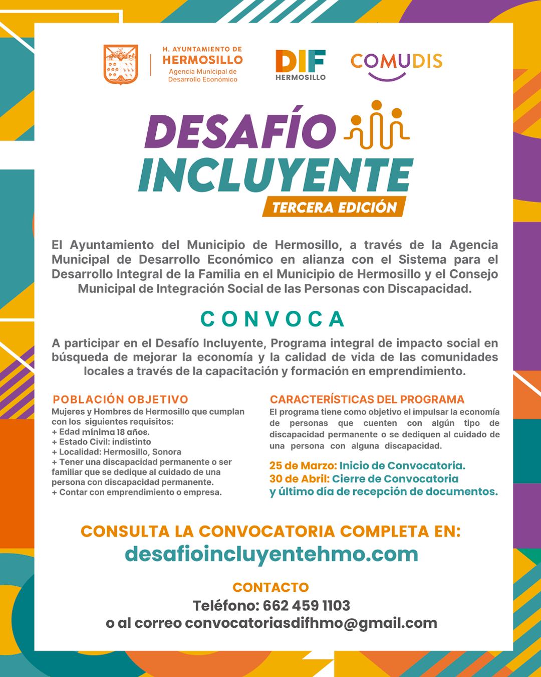 Hermosillo, Sonora; 29 de abril, 2025.- La convocatoria de la tercera edición de «Desafío Incluyente» para personas con discapacidad permanente o familiar cuidador que deseen fortalecer su emprendimiento se extendió hasta el 16 de mayo, con la oportunidad de ganar el concurso que cuenta una bolsa de 200 mil pesos en premios en efectivo y especie.