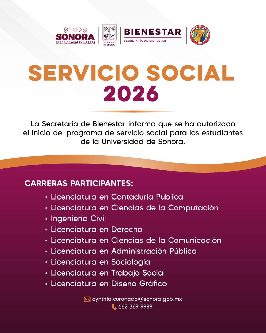 Hermosillo, Sonora; 10 de abril de 2026.– El Gobierno de Sonora, a través de la Secretaría de Bienestar, invita a estudiantes de la Universidad de Sonora a integrarse a sus programas de servicio social, como parte de las acciones derivadas del convenio de colaboración firmado recientemente entre ambas instituciones.