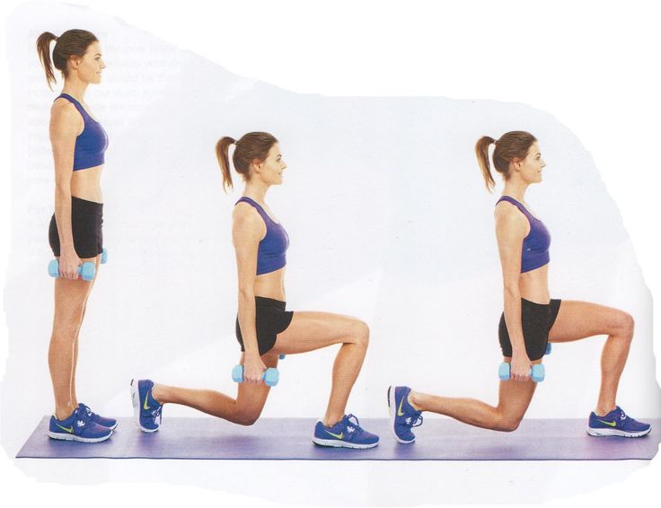 Dé un paso hacia adelante con la pierna derecha y deje el pie izquierdo en su posición original mientras baja su cuerpo; manteniendo siempre el torso derecho y la mirada hacia el frente. Inhale mientras baja. No permita que la rodilla vaya más adelante de sus pies para no lastimar su rodilla.
