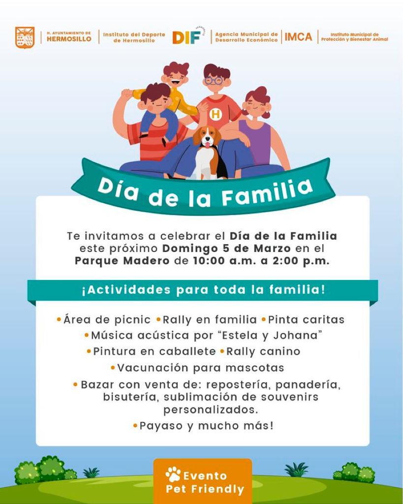 Hermosillo, Sonora; 4 de marzo, 2023.- El Gobierno Municipal ofrecerá a las familias en el Parque Madero una fiesta tipo picnic con música en vivo, actividades deportivas, concursos, venta de producto y diversión en un ambiente amigable con las mascotas.