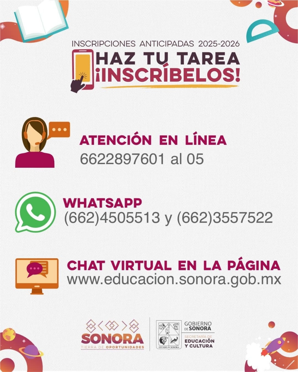 Gámez Gamboa subrayó que la SEC brinda orientación a través de la Línea de la Educación: 6622 89 76 01 al 05, en un horario de 8:00 a 16:00 horas de lunes a viernes; chat en línea en la página https://educacion.sonora.gob.mx/ y por WhatsApp: 6624 505513 y 6623 557522.