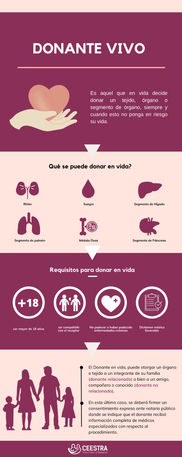 De acuerdo al Centro Estatal de Trasplantes (Ceestra), existen varios tipos de donaciones, entre ellas, de una persona viva quien puede otorgar un órgano o tejido a un integrante de su familia, o bien, a un amigo, compañero o conocido.