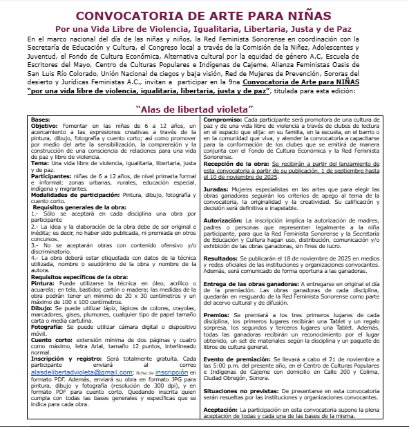 Hermosillo, Sonora; 8 de octubre de 2025.- En el marco de la conmemoración del Día Internacional de la Niña, que se celebrará el próximo 11 de octubre, la Comisión de Derechos de la Niñez, Adolescencia y la Juventud del Congreso del Estado invitó a participar en la convocatoria “Arte para Niñas: Por una Vida Libre de Violencia, Igualitaria, Libertaria, Justa y de Paz ‘Alas de Libertad Violeta’”, con el propósito de promover la expresión artística y el empoderamiento de las niñas sonorenses.