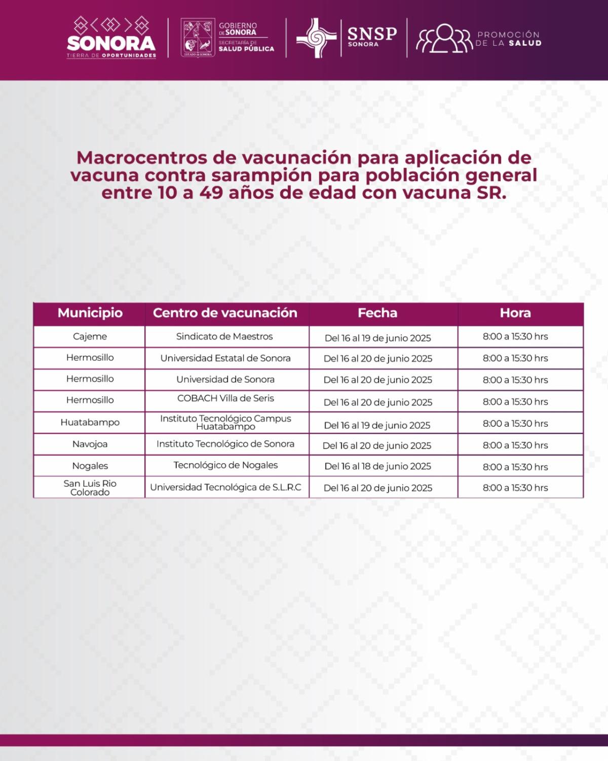 La SSP detalló que, en coordinación con el Centro Estatal de Vacunas, se instalaron macrocentros de vacunación, estos en los municipios de Hermosillo, Cajeme, Huatabampo, Navojoa, Nogales y San Luis Río Colorado, mismos que estarán abiertos en un horario de 8:00 a 15:30 horas.