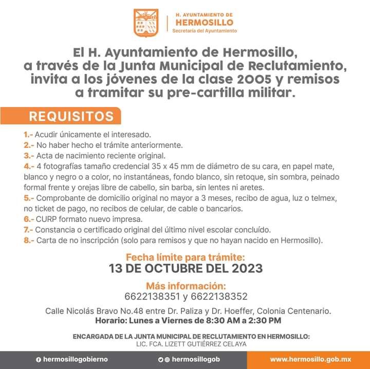 Hermosillo, Sonora; 26 de junio, 2023.- Jóvenes de la clase 2005 y remisos podrán aprovechar el periodo vacacional para realizar su trámite de precartilla militar, debido a que habrá personal de guardia en las oficinas de Servicios de Gobierno para atenderlos.
