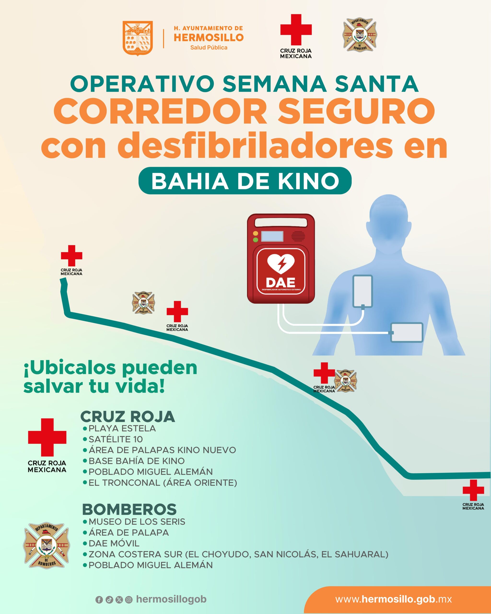 Hermosillo, Sonora; 18 de abril, 2025.- La Dirección de Salud Pública Municipal, en coordinación con el Departamento de Bomberos de Hermosillo y con la Cruz Roja Mexicana tienen corredores cardio protegidos con desfibriladores en esta Semana Santa, para tener una acción rápida en caso de que alguna persona requiera reanimación.