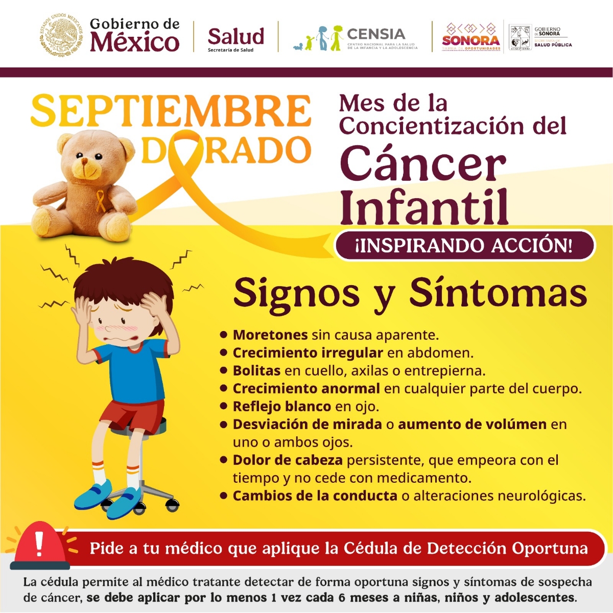 Hermosillo, Sonora; 19 de septiembre de 2025.- El Gobierno de Sonora, a través de la Secretaría de Salud Pública, hace un llamado a la población a estar atenta a los principales signos y síntomas del cáncer infantil, con el propósito de lograr una detección temprana y brindar un tratamiento oportuno que salve vidas.