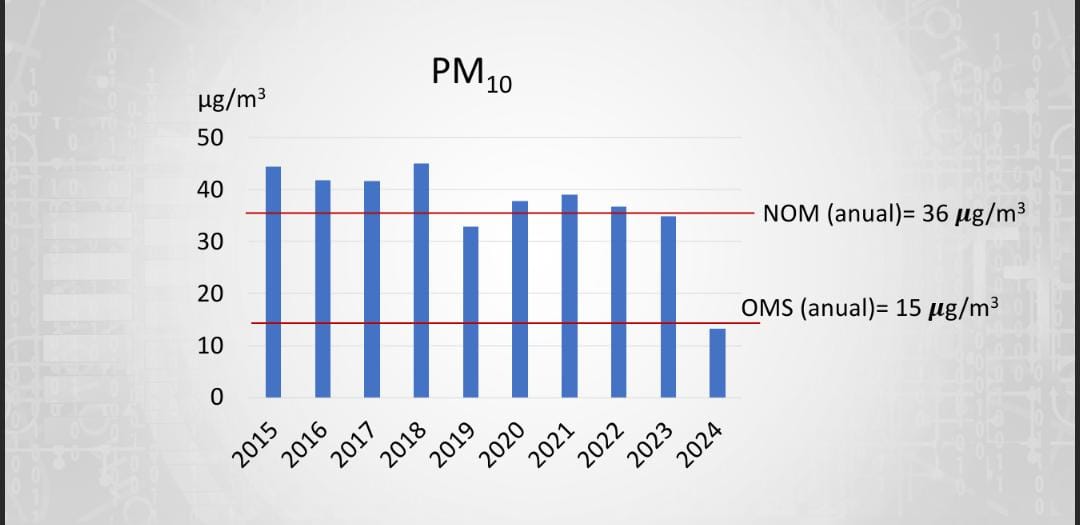 “La Organización Mundial de la Salud (OMS) marca un límite máximo de 15 PM10 y algo que pasa muy interesante es que del 2023 al 2024 bajó, es la primera vez que estamos por debajo del límite de la OMS entonces sería muy interesante analizar qué acciones implementaron para que esto sucediera porque en el 2023 no llovió, evidentemente es una acción que se tomó de parte del municipio para lograr que esto disminuyera de esta manera, es una muy buena noticia”, expresó.