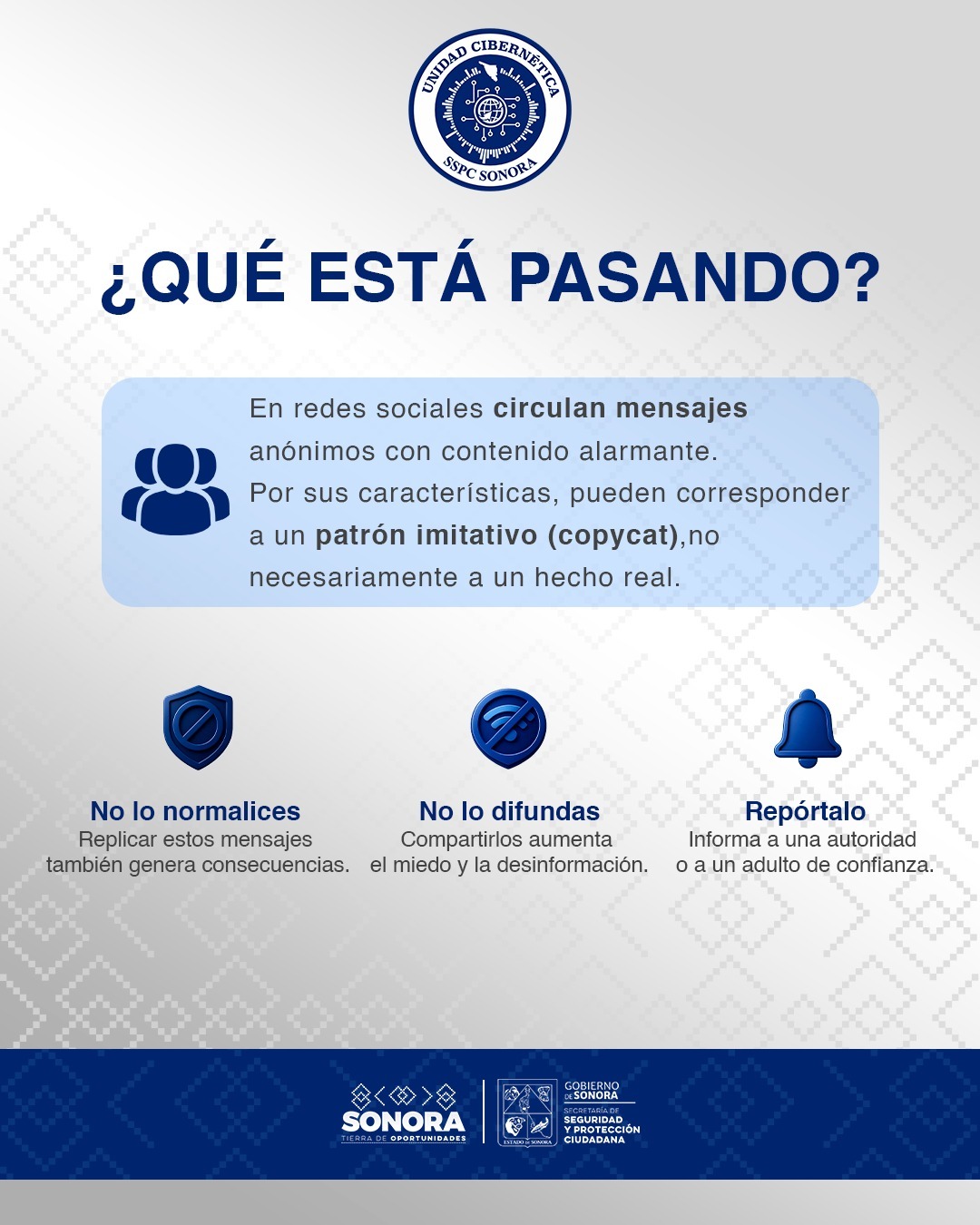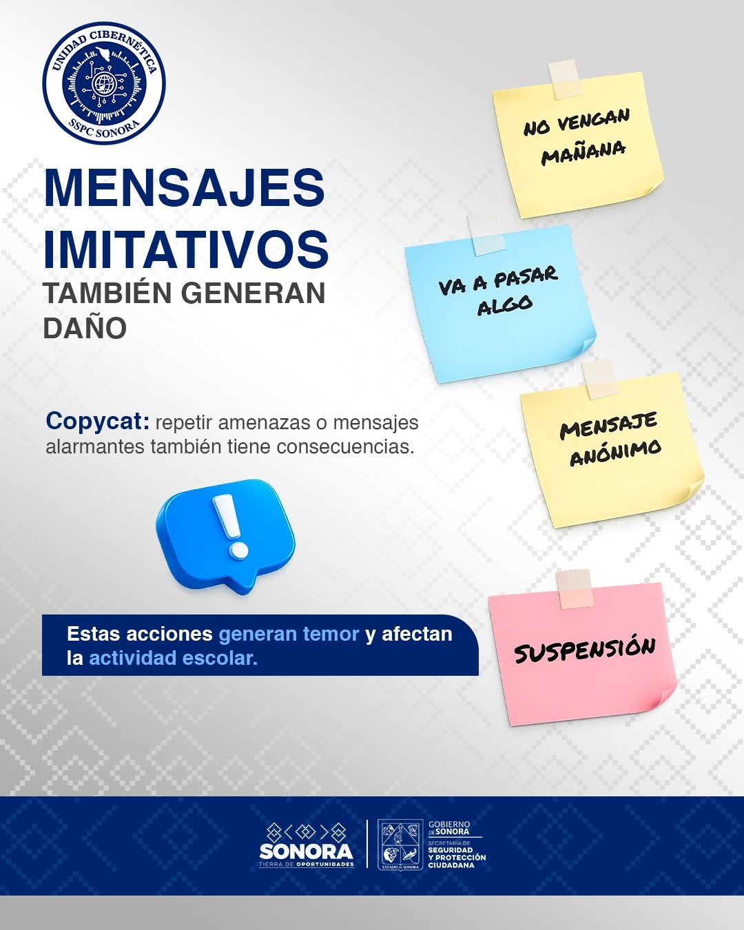El titular de la Unidad Cibernética de la SSPC Sonora, Jesús Mario Gastélum Rochín, explicó el fenómeno conocido como “copycat”, el cual consiste en imitar o replicar conductas que generan alarma, con el objetivo de provocar la suspensión de clases en los planteles escolares.